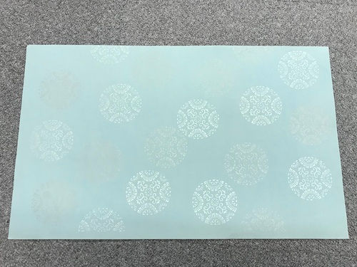 先日、唐長の誠次さんから『こんな雰囲気の帯ってどうなんやろ?』と、そんないつもよりも軽い感じで見せて頂いた唐紙がありました。瓶覗に近い色、見る角度で完全に文様が隠れてしまう淡い濃淡。空気感が最高に素晴らしい唐紙でした(一応撮ってみましたが・・・)。