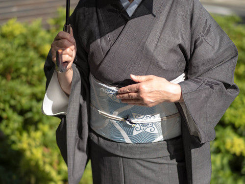 写真のコーディネートは・・・。 着物→タテヨコ絣の夏大島/トンボ柄 帯→経箔の彩綾(さいりょう)の名古屋帯