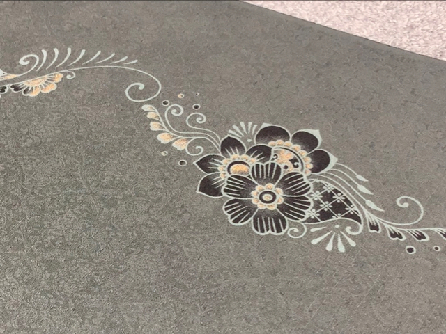 今回織り上がった反物は、生地の特性を活かした、縦ボカシ(おそらく麹塵染)。もう一つは唐長文様『双葉葵』。 特に双葉葵は、生地の光沢と紬節を考慮に入れながら、抜染で行こうと配色しています。 どんな風に上がってくるかは、乞うご期待です。