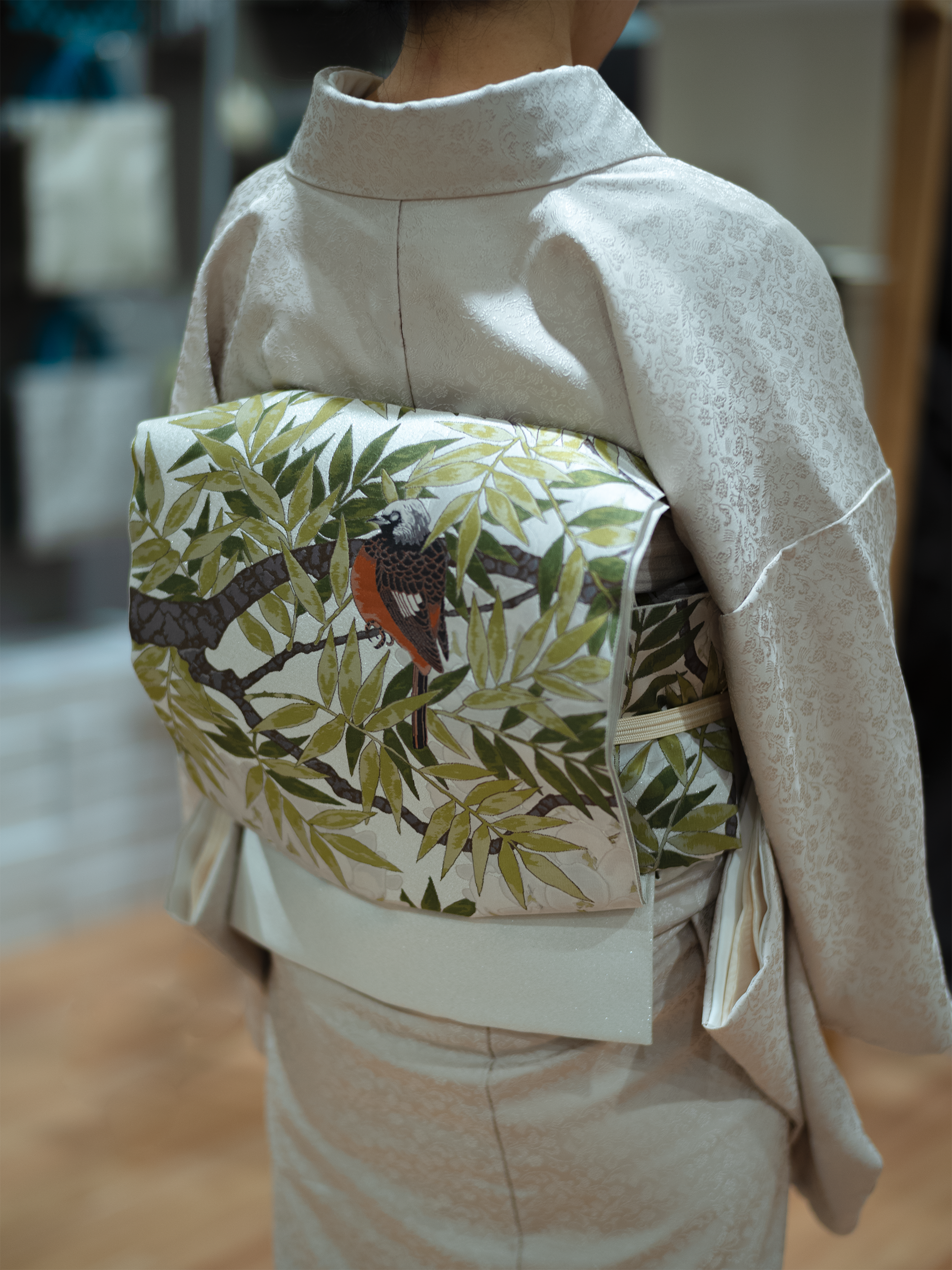 屏風作品の一番右、部分。そこをお太鼓中心にして紋上げをしています。作品では銀箔が底にあり(帯では白に銀糸)ます。先の鋭い緑黄緑濃淡の葉の中で佇んでいる姿、このジョウビタキとのコントラストが素敵に感じました。また、色彩だけではなく、一番右の奥から全体を傍観している様にも見える『ジョウビタキ』、自分の中ではかなり印象的です。また、作品全体には静かでも動きを感じますが、このジョウビタキ部分。ここに関しては数分後でも、このままでいそうな、静。ここにも惹かれました。